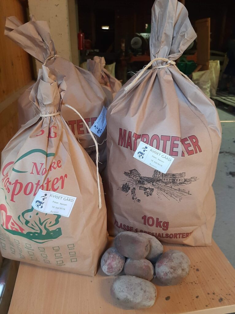 Direktesalg av poteter og kjøtt foregår på gården så lenge lagrene rekker, enten under annonsert aktivitet eller etter avtale. Men kjører man forbi og bare stopper innom så er vi ofte stort sett hjemme på tunet en plass.